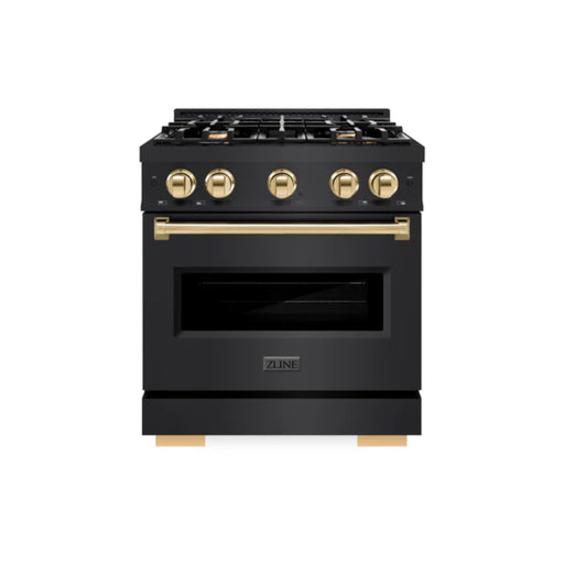 ZlineThe ZLINE Autograph Edition Classic Gas Range CGRSZ-BLM series in satin stainless steel with black matte doors and polished gold accents brings tog...