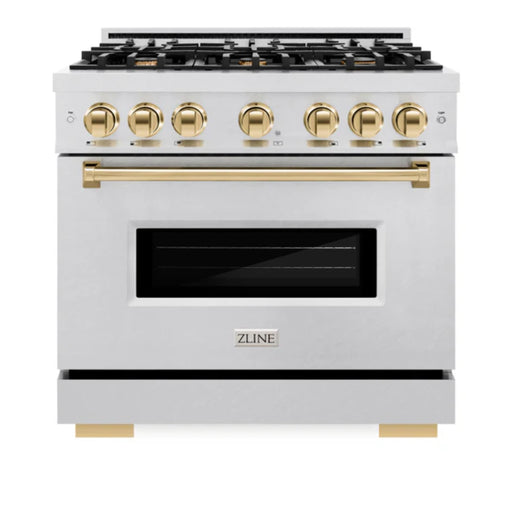 View full detailsZLINE Autograph Edition Classic Gas Range with Convection Gas Oven in Satin Stainless Steel and Polished Gold Accents