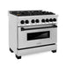 *36”: 6 brass burners (4,200–18,000 BTU), 4.6 cu. ft. oven