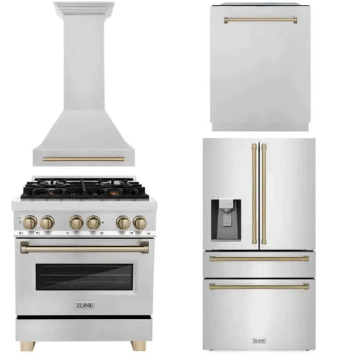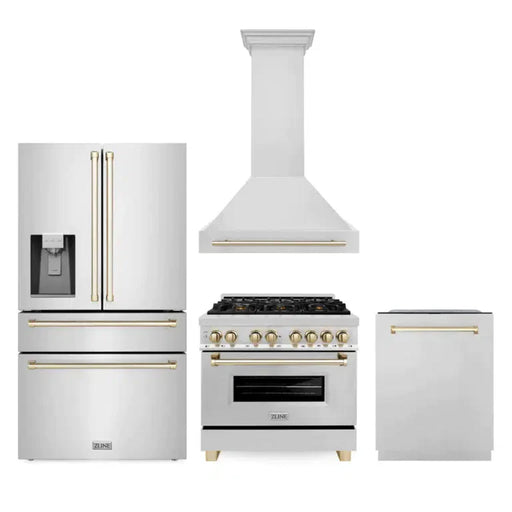 View full detailsZLINE Autograph Edition 30", 36", & 48" Stainless Steel 4-Piece Kitchen Package with Polished Gold Accents—Dual Fuel Range, Wall Mount Range Hood, Dishwasher, and Refrigerator.