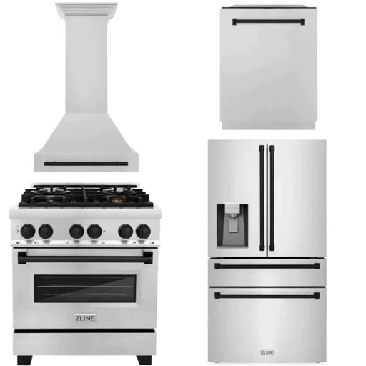 View full detailsZLINE Autograph Edition 30", 36", & 48" Stainless Steel 4-Piece Kitchen Package with Matte Black Accents—Dual Fuel Range, Wall Mount Range Hood, Dishwasher, and Refrigerator.