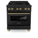 Crafted with precision, this range features a striking black stainless steel finish that resists fingerprints and smudges, ensuring your appliance stays clean and polished with minimal maintenance. The luxurious Champagne Bronze accents add an elegant touch, making this range not just a functional cooking appliance but a stunning statement piece in your kitchen.