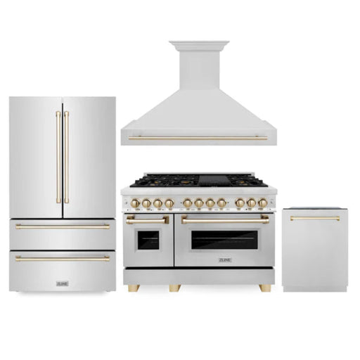 View full detailsZLINE Autograph Edition 48" 4-Piece Kitchen Package with Dual Fuel Range, 36" Refrigerator, Wall Mounted Range Hood, and 24" Tall Tub Dishwasher in Stainless Steel with Polished Gold Trim