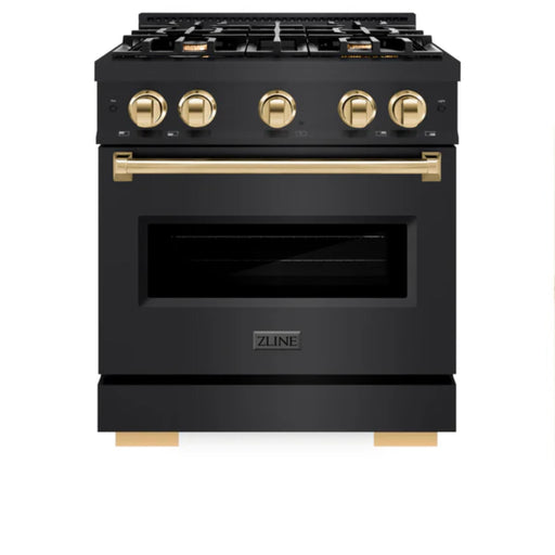 ZlineThe ZLINE Autograph Edition Classic Gas Range CGRSZ-BLM series in satin stainless steel with black matte doors and polished gold accents brings tog...